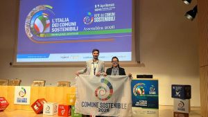 Da sinistra: l’assessore. Matteo Sanchioni e la sindaca Marila Girolomoni con la bandiera dei Comuni sostenibili Articolo: Bambini e adulti insieme...